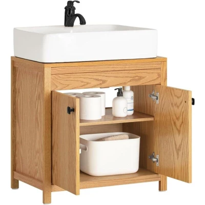 General description With this under sink cabinet, maximizing space in your bathroom becomes easier. The cupboard is spacious enough to ensure ample storage for all your bathroom essentials. It features a simple and elegant design that fits perfectly with any style of decor. This space-saving storage solution will help keep your bathroom tidy and organized. Technical specifications Material: MDF, particle board Finish: Oak wood veneer Dimensions: W60 x D35 x H60 cm Weight: 13.8 kg Load capacity: 25 kg Compatibility and accessories 'U' shaped cut-out slots for easy placement underneath your sink (please measure before purchasing) Installation Item comes in a flat pack and requires self-assembly Detailed instructions supplied Other information The basin is NOT included in the delivery The decorative elements are not included in the delivery The wood grain's natural growth is captured, meaning no two pieces will be identical and colors and textures may vary slightly