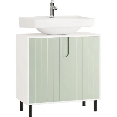 General description Modern design under sink cabinet in white and light green will bring a fresh and natural look to your bathroom while keeping it nicely organized. The cupboard is spacious enough to ensure ample storage for all your bathroom essentials, featuring an adjustable shelf behind the doors that can be set to three different heights or removed entirely. The 'U' shaped cut-out slots allow for easy placement underneath your sink (please measure before purchasing). Technical specifications Material: MDF, particle board, metal Dimensions: W60 x D30 x H60 cm Weight: 10.1 kg Load capacity: 30 kg Installation The item comes in a flat pack and requires self-assembly. Detailed instructions are supplied. Other information The basin and decorative elements are NOT included in the delivery.