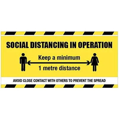 A social distancing pvc banner. Ideal for high traffic areas to remind staff and visitors of safety procedures and safe 1 metre social distances. Flame and weather resistant 440gsm PVC banner Ideal for both internal and external use Digitally printed for eye catching displays Includes reinforced eyelets for easy fixing to fencing with bungee ties or cable ties (not included)