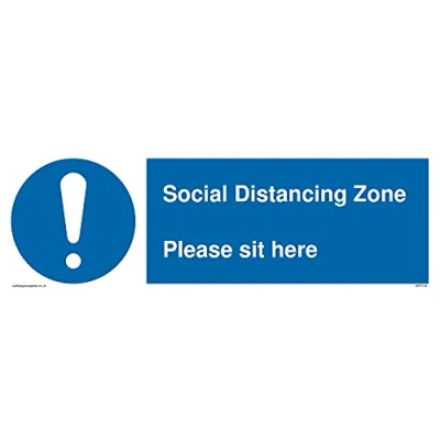 M001 : General mandatory action This sign is made from vinyl high tack A stickier sticker. Uses a stronger adhesive to make it more suitable for plastic surfaces like Wheelie Bins or where the sticker might get rubbed. 31 landscape Sign Text: Social Distancing Zone Please sit here