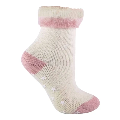 These alpaca wool bed socks with a star patterned gripper sole have been crafted with both warmth and comfort in mind. Made from a blend of alpaca wool, a fibre with natural thermal qualities, they are ideal to be used as both night or lounge wear. The sock is knitted with a close knit pattern on the outside, while the inside of the sock is brushed to create a beautiful soft feel which helps to add to the warmth of the sock. These socks have a star patterned gripper sole, helping to keep you secure on slippery household flooring, such as wooden panels or laminate. These socks have a turnover top, which adds to the comfort securing the socks in place, while also adding some style to the socks in the classic fluffy bed sock fashion. This sock is available in a size 4-8 uk - available in cream with the choice of beige, salmon or purple heels and toes this sock is an ideal addition to any woman's wardrobe. They are made of 60% Acrylic, 20% Wool, 10% Alpaca, 8% Polyamide, 2% Elastane and are machine washable.