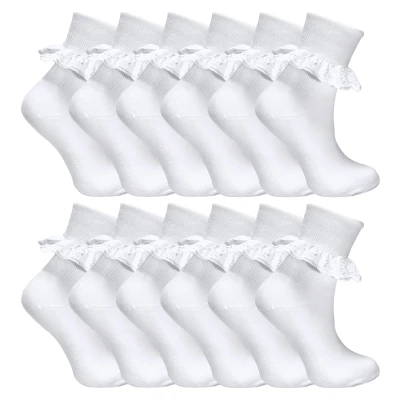 Sock Snob 12 Pair Multipack White Frilly Lace Socks 7 Sizes Girls Cute Cotton Rich School (11 14 Years, White)