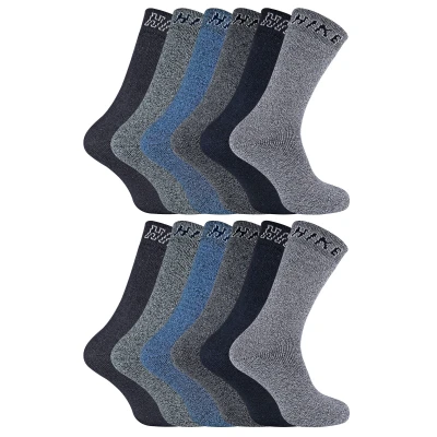 12 Pack Mens Cotton Rich HIKE SocksIf you are looking for a sock that is great for hiking, work or any other outdoor activities then these Men’s Cotton Rich HIKE Socks would be a great companion on your next trek. Not only are these made for Hiking but these are great value for money, coming in a 12 Pair Value Pack so you’ve got plenty of socks to last in the great outdoors!These socks are made from a cotton rich fabric providing ultimate comfort and durability. They also have full cushioning that protects high impact areas and reduces the chance of blisters and discomfort.These also have a comfort welt so that isn’t too tight so that it creates nasty constriction rings but it's not too loose so that they fall down easily. The word “HIKE” is stitched at the top of the socks to pop up over the top of your boots.These socks are available in 2 Variations including Grey or Blue assortments. They are available in sizes 6-11 UK / 39-45 EU / 7-12 US and are made from 63% Cotton, 34% Polyester, 2% Nylon, 1% Elastane. They come in a Pack of 12 and are Machine Washable.Extra Product Details12 Pack Hiking SocksValue For MoneyFully CushionedComfort WeltMade For The OutdoorsComfort & DurabilityGrey or Blue Colour Assortments63% Cotton RichMen’s One Size: 6-11 UKMachine Washable