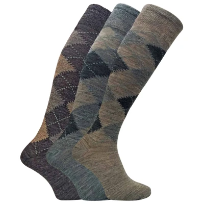 A traditional argyle wool sock has always been considered as one of the essentials for a man’s sock drawer, this extra-long version will serve as a traditional looking sock that will cover your legs up to over the knee height. This 3 pack offers a soft touch on the foot, protection in rough terrains and warmth to trap the natural body heat that is created by your feet. The wide top of the socks provides intense comfort around the legs whilst a wool blend provides a soft cushion for the foot. The lamb's wool blend incorporated into the manufacturing of these socks gives them the thermal ability to keep your feet warm in cold temperatures for long periods of time, meaning you can enjoy the great outdoors in comfort and warmth for longer. These are an extra-long version of a traditional lamb’s wool sock and will reach above the knee. The traditional argyle patterns available come in 2 options, a brown mix, and a grey mix. One size is available in a 6-11 UK 7-12 US 39-45 eur and they are easily machine washable..
