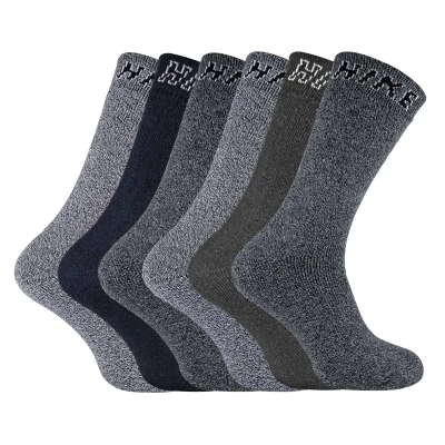 Mens Cotton Rich HIKE Socks If you are looking for a sock that is great for hiking, work or any other outdoor activities then these mens cotton rich HIKE socks would be a great companion on your next trek. These socks are made from a cotton rich fabric providing ultimate comfort and durability. They also have full cushioning that protects high impact areas that reduces the chance of blisters and discomfort. These also have a comfort welt so that isn't too tight so that it creates nasty constriction rings but its not too loose so that they fall down easily. The word ‘HIKE’ is stitched at the top of the socks to pop up over the top of your boots. These socks are available in 2 Variations including grey assortments and blue assortments. They are available in sizes 6-11 UK / 39-45 EU / 7-12 US and are made from 63% Cotton, 34% Polyester, 2% Nylon, 1% Elastane. They come in a Pack Size of 6 and are Machine Washable. Extra Product Details - Hiking socks - Sizes 6-11 UK / 39-45 EU / 7-12 US - 6 Pack - Cotton Rich - Full cushioning - Comfort Welt - 63% Cotton, 34% Polyester, 2% Nylon, 1% Elastane - Machine Washable