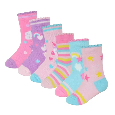 If you need to stock up on the little ones' sock drawer but want to make sure that you’ve got socks to last them as well being soft and comfy for their tiny feet then why not consider these great 6 Pack Cotton Rich Unicorn Socks? Designed with you little girl in mind, these socks come with cute and pretty patterns of the popular mythical creature, Unicorns on them! With great pinks, purples, stars and rainbow patterns, as well as a couple of striped socks included, there's plenty for you to choose from in one pack. These baby girl socks are Cotton Rich which will make sure that their feet remain super soft and comfortable throughout the day. These socks come in 6 pairs with Unicorns, Stars, Rainbows and more on them and are available in 3 sizes: 0-6 Months, 6-12 Months & 12-24 Months. They are made from 78% Cotton; 20% Polyester; 2% Elastane and are Machine Washable.