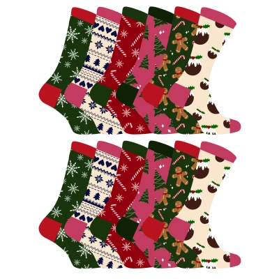 Christmas is coming, and you know what that means: it's time to start thinking about gifts for your loved ones. It's never easy to find the perfect present for the woman in your life, but we've got a great suggestion for you, our very own branded Sock Snob Ladies Festive Christmas Socks! They come in red, green, pink and cream colours so they'll go with any outfit. Each pair comes with a festive design which include: Candy Canes, Fairisle, Christmas Trees, Snowflakes, Xmas Puddings and Gingerbread Men. They're just waiting to keep your feet warm and comfy through every holiday party and family gathering. Made from cotton rich fibres, these socks are full of comfort and have a comfort top to keep them in place. These would make a great stocking filler and you can choose from a range of multipack options: 6 pairs, 12 pairs or 24 pairs - so you can get even more bang for your buck! We all love a little bit of Festive cheer at Christmas time, and these Women's Festive Christmas Socks from Sock Snob are the perfect way to add some festive colour to the wardrobe. Whether you are looking for Xmas socks for yourself to go with your Christmas jumper or for a family member you’ll be satisfied. These socks come in packs of 6, 12, or 24 Pairs, with many festive patterns per pack. They’re made from 51% Cotton 31% Nylon 16% Polyester 2% Elastane, are available in sizes 4-8 UK, 37-40 EU, 5-9 US and are machine washable.