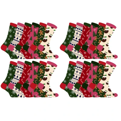 Sock Snob - Ladies Festive Christmas SocksChristmas is coming, and you know what that means: it's time to start thinking about gifts for your loved ones. It's never easy to find the perfect present for the woman in your life, but we've got a great suggestion for you, our very own branded Sock Snob Ladies Festive Christmas Socks!They come in red, green, pink and cream colours so they'll go with any outfit. Each pair comes with a festive design which include: Candy Canes, Fairisle, Christmas Trees, Snowflakes, Xmas Puddings and Gingerbread Men. They're just waiting to keep your feet warm and comfy through every holiday party and family gathering.Made from cotton rich fibres, these socks are full of comfort and have a comfort top to keep them in place. These would make a great stocking filler and you can choose from a range of multipack options: 6 pairs, 12 pairs or 24 pairs - so you can get even more bang for your buck!We all love a little bit of Festive cheer at Christmas time, and these Women's Festive Christmas Socks from Sock Snob are the perfect way to add some festive colour to the wardrobe. Whether you are looking for Xmas socks for yourself to go with your Christmas jumper or for a family member you’ll be satisfied.These socks come in packs of 6, 12, or 24 Pairs, with many festive patterns per pack. They’re made from 51% Cotton 31% Nylon 16% Polyester 2% Elastane, are available in sizes 4-8 UK, 37-40 EU, 5-9 US and are machine washable.Extra Product DetailsLadies Christmas SocksSock Snob BrandedCotton Rich FibresMultipack Options: 6, 12 or 24 Pairs6 Festive Designs Per PackComfort TopRed, Green, Pink & Cream ColoursA Perfect Xmas GiftGreat Value For MoneyMen’s One Size: 4-8 UKMachine Washable