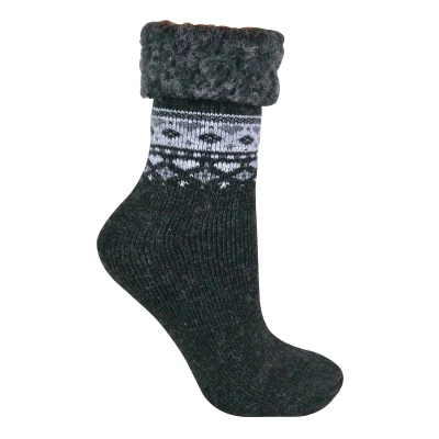 Our stylish ladies turn-over wool socks are the ideal addition to any stylish woman’s wardrobe who values both warmth and comfort. With this socks turn-over top - it is ideal for wearing with short booties for a stylish daytime look. Alternatively, this sock can also be paired with your most comfortable lounge-wear, and can be worn whilst relaxing to keep feet comfortable and warm at home. These socks have a soft brushed inner, making the sock gentle and fluffy. This brushed inner also helps to trap warmth closer to the skin, making this sock incredibly cosy for a night in or going outside during the winter months. With a stylish fairisle print on the outside of the socks, these socks are perfect for anyone's winter wardrobe. Available in 5 different colours, these socks are size 4-8 UK and are the perfect gift to your feet! These socks are made of 63% Acrylic, 24% Wool, 12% Polyamide, 1% Elastane and are machine washable.