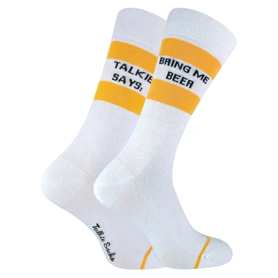 Are you looking to make an impression with your new found sock swag? If you are then look to the refreshing new brand that is Talkie Socks with their vast new collection. This range of bring me a beer & vodka socks (not mixed) are an ideal gift for anyone who is looking for a small for a friend or family member. Or, you might simply want to tell others that you are desperate to have your favourite drink delivered to you. The Talkie Socks logo is printed on the foot of the sock. These soft cotton crew socks have knitted designs of messages you may want people to notice on your feet. Pick between demanding a beer or vodka courtesy of Talkie socks. One sock has ‘TALKIE SAYS’ on it whilst other has the demand ‘BRING ME BEER’ or ‘BRING ME VODKA’ on it. The main body of the sock is white but there are also blue & yellow finishes on each of the socks as well. As a gift, these socks are a brilliant secret santa or stocking filler idea. They are also made out of breathable cotton and are cotton rich with a content of 70% cotton 28% nylon and 2% elastane. Unlike some other design socks, Talkie Socks also focuses on comfort. They also have a handlinked toe to decrease the irritability of the toe seam, not only making your feet stylish but also happy. These socks are available in a size 6/11 UK 39/45 EU 7/12 US and they are available to purchase in a one pair pack. They are also safely machine washable.