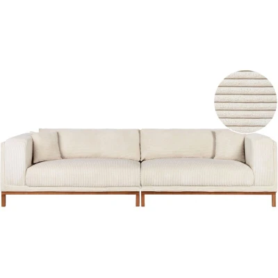 Modern Jumbo Cord Couch with Wooden Legs. Add comfort and style to your living area with this four-seater sofa. Upholstered in durable fabric, it offers thick, comfortable cushions, while its wooden legs guarantee stability and complement the beige colour. This piece is a perfect addition to any modern or traditional interior setting. Details: Product Type: 4 Seater Sofa General Color: Beige, Brown Shade: Light Beige Material Type: Fabric Main Material: Corduroy Additional Material: Eucalyptus Wood Filling Material: Foam Material Composition: 100% Polyester Arm Style: Track Pattern: Solid Seat Construction: Sinuous Springs Seat Foam Density: 30 kg/m3 Seats Up To: 4 People Dimensions: Armrests Height: 79 cm Depth: 90 cm Seat Thickness: 22 cm Seat Height: 46 cm Width: 308 cm Height: 79 cm Seating Surface: 83x108 cm Weight: 60 kg Weight Capacity per Person: 150 kg Offer Includes: 1 x Sofa, 2 x Scatter Cushion Key Features: Thickly Padded for Utmost Comfort, Great Relaxation Spot, Perfect