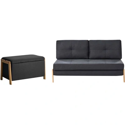 Set of Sleeping Couch & Storage Bench. This modern living room set includes a comfortable sofa and a coordinating bench. The sofa can be converted into an extra sleeping area, while the bench features concealed storage for blankets or pillows. Both pieces are upholstered in fabric, supported by iron legs, making them well-suited to modern interiors. The set stands out for its versatility and multifunctional design. Details: Product Type: Sofa Set General Color: Black, Brown Material Type: Fabric Main Material: Fabric Additional Material: Iron Filling Material: Foam Material Composition: 100% Polyester Seat Construction: Sinuous Springs Seat Foam Density: 46 kg/m3 Seats Up To: 3 People Sleeper Function: Yes Sofa Bed Open Mechanism: Fold-Out Dimensions: 2 Seater Sofa Dimensions: 152x76x94 Ottoman Dimensions: 75x44x43 cm Seat Thickness: 13 cm Seat Height: 39 cm Overall Dimensions: 152x76x92 Weight: 51 kg Weight Capacity per Person: 120 kg Offer Includes: 1 x Sofa, 1 x Bench Key Features: