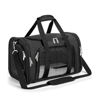 High Quality Material:Sturdy steel frame cage structure and wooden support board maintain good spatial stability and shape. The breathable mesh windows on four sides ensure good air circulation and vision, allowing pets to have a comfortable and safe trip. You can also easily check on your pet. Dimension & Weight:Made of tear resistant durable fabric.Four easy entrances for pets. Dimensions: 17 inch/43 cm x 11 inch/28 cm x 11 inch/28 cm (L*W*H), suitable for pets up to 16 lbs/7.3kg. Please don't choose your carrier based on weight only,consider your pet's length and height when choosing a carrier. Airline Approved & Safty:Can be placed under the seats of most airplanes(Four non-slip feet on the bottom to prevent movement), and comfortably on the seat next to you in a car or bus. Has a adjustable shoulder strap. Can also be fastened to the car seat with a safety belt or shoulder strap to keep your pet safe. Easy to Clean :You can use a soft cloth to clean the stains and dirt on the surface. The soft pad inside the pet carrier is removable and washable, you can take it out to wash and easily solve all stains. Easy to Fold & Pocket:The foldable design makes it compact and easy to store. There is a front pocket to store pet food, toys, treats, etc.