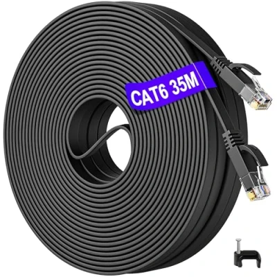 ✔High Speed Performance: Cat 6 Ethernet cable supports data transfer speeds up to 1 Gigabit per second, ensuring fast and reliable internet connectivity for gaming, streaming, and downloads. ✔Flat Design: Ultra-slim flat cable design allows for easy installation under carpets, along baseboards, and through tight spaces while maintaining optimal network performance. ✔Durability and Stability - UTP (Unshielded Twisted Pair) patch cable adopts a twisted pair structure for stable transmission to minimize the effects of signal interference. It has good flame resistance, very suitable for integrated wiring. And the snagless plug design to help prevent damage when plugging and unplugging cables. The outer jacket is made of PVC material, which is resistant to abrasion and bending, ensuring environmental protection and durability. ✔Extended Length: 35-meter cable provides extensive coverage for large spaces, perfect for connecting devices across multiple rooms or floors in homes and offices. ✔Universal Compatibility: RJ45 connectors ensure seamless connection with various network devices including routers, modems, computers, gaming consoles, and smart TVs.