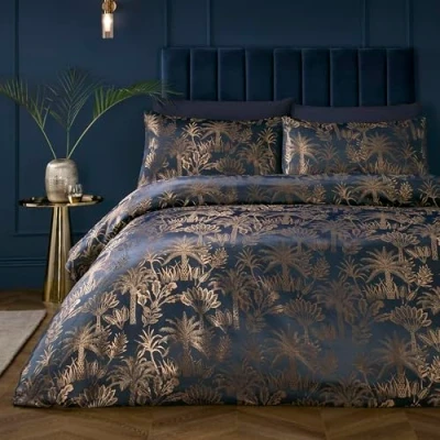 LUXURY DESIGN: Elegant jacquard duvet cover set featuring tropical palm trees woven with shimmering metallic yarn, complemented by a plain-dyed polyester reverse side. SET CONTENTS: Complete bedding set includes one Super-King size duvet cover (260 cm x 220 cm) and two matching pillowcases (76 cm x 48 cm). MATERIAL COMPOSITION: Crafted from 100% recycled polyester fabric with a substantial 300 gsm weight for durability and comfort. CARE INSTRUCTIONS: Machine washable - wash before use, separate dark colours, tumble dry on cool setting, and iron on reverse side at low temperature. DIMENSIONS: Super-King duvet cover measures 260 centimetres in width by 220 centimetres in length, perfect for standard UK Super-King beds.