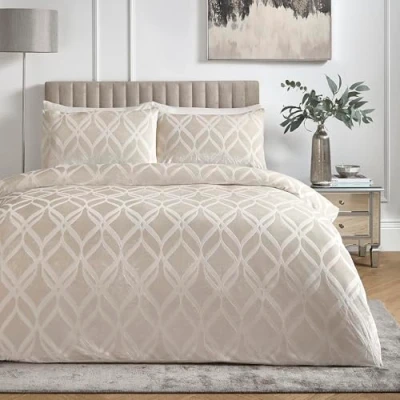 LUXURIOUS DESIGN: Stunning velvet duvet cover set featuring an elegant ogee pattern with curved overlapping diamond design in a sophisticated champagne colour. SET CONTENTS: Complete king size bedding set includes one duvet cover (230 cm x 220 cm) and two matching pillowcases (76 cm x 48 cm). PREMIUM MATERIAL: Crafted from 100% polyester with a sumptuous velvet texture, weighing 290 gsm for superior comfort and durability. CARE INSTRUCTIONS: Machine washable at 40 degrees, cool tumble dry permitted, cool iron on reverse side for easy maintenance. PERFECT FIT: Designed to fit standard UK king size duvets, featuring convenient closures and precise stitching for a polished look.