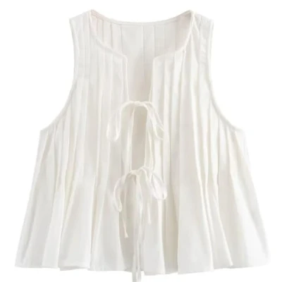 SOKTDO Bow Tie Front Tops For Women Tank Top Pleated Sleeveless Blouse Peplum Blouse(White,S)