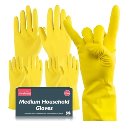 Resilient and Versatile: Our kitchen rubber gloves provide a non-slip advantage for a secure grasp during household cleaning, doubling as robust rubber gloves for cleaning that won't falter in the face of grime or hot water. Medium-Sized Mastery: Flock-lined for comfort, these medium-sized yellow gloves strike the perfect balance between coverage and dexterity, ideal as washing up gloves medium for daily kitchen tasks. All-Around Home Helper: Multitasking is a breeze with these rubber gloves medium, designed to transition smoothly from gloves kitchen duty to general gloves for cleaning, ensuring a spotless home from basement to attic. Shielded in Style: Our washing gloves medium are your first line of defense against harmful substances, fashioned in vibrant yellow, they bring brightness and safety to your cleaning routine. Bulk Bounty: Stock up and stay prepared with 4 pairs of our washing gloves, structured for sturdiness and ready for action in every corner of your home, ensuring a hygienic environment without the worry of cross-contamination.