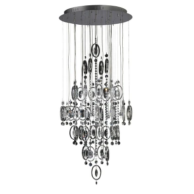 This bohemian influenced range couples various elements to create a harmonious collection. The clear multi facetted oval crystals are suspended within oval glass pieces. Each glass piece is then finished by adding a clear crystal button hanging from the bottom of the component. This exquisite combination is suspended from a Polished Chrome framework which intensifies the beauty of this range.
