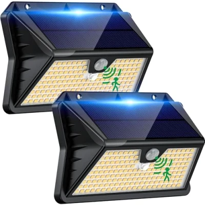 Solar Lights Outdoor Garden 185 LED Motion Sensor Security Lights, Powered Wall Lighting with 3 Modes, IP65 Waterproof, Ideal for Patio, Fence, Driveway 2 Pack Warm White