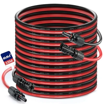 Solar Panel Extension Cable with Waterproof Female and Male Connectors 4mm²/6mm² 3m/5m/10m/15m, for Panels Photovoltaic Systems (Red + Black) (4mm²/15m)