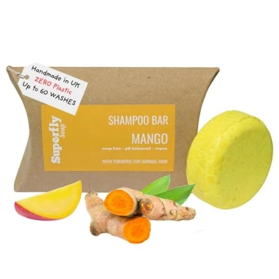 BAR SHAMPOO WITH NATURALLY DERIVED INGREDIENTS: Our handcrafted natural shampoo bar is made using 98% naturally derived premium ingredients. These are silicone free, sulfate free and SLS free shampoo bars handmade in the UK. Formulated for normal hair with an exotic mango and turmeric fragrance. OUR SOAP FREE SHAMPOO BAR GENTLY CLEANSES AND HYDRATES with a luxurious instant lather, even in hard water! No adjustment period needed if changing to a shampoo block/solid bar from regular shampoos. ECO FRIENDLY AND VEGAN HAIR SHAMPOO BAR: Our chemical free shampoo bar comes in ocean friendly packaging with zero plastic, eliminating waste completely. Suitable for vegans and 100% cruelty free. DEEPLY NOURISHING AND HYDRATING FOR HEALTHY HAIR: Enriched with Keratin and vitamin Pro B5 to help strengthen your hair from the roots, this hair strengthening bar shampoo for hair is purposefully PH balanced to be close to that of your own hair. ZERO WASTE & PERFECT AS A TRAVEL SHAMPOO BAR: Superfly’s premium round shampoo bar is a handmade zero waste product, ecologically packaged with zero plastic. Contains no sulphates, colourants or palm oil, making for ideal eco gifts. Shampoo in a bar form is allowed in hand luggage unlike traditional liquid varieties. Whilst also being lighter, smaller, easier to carry, and with no chance of leaking and ruining your trip. GENTLE CLEANSING AND HEALTHIER HAIR AND SCALP. Not to be confused with cheaper solid shampoo bars UK wide, often using Sodium Coco Sulfate and other nasty ingredients, we only use pure premium ingredients in our naturally derived plastic free shampoo bars. It was developed to cleanse and moisturise without stripping away your hair's natural oils.