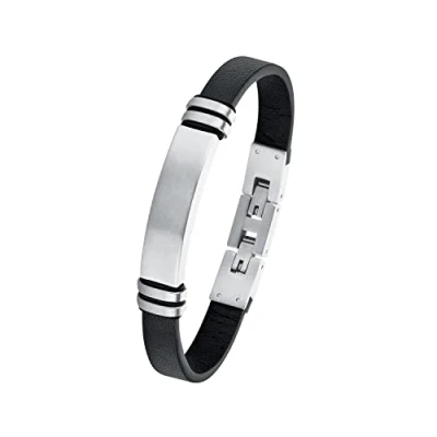 Fashionable leather bracelet with engravable ID plate made of robust stainless steel of the brand s.Oliver Bracelet made of black cowhide leather - bracelet width approx. 12 mm By removing a link on the clasp, this bracelet can easily be shortened from 21.5 cm to 20 cm.