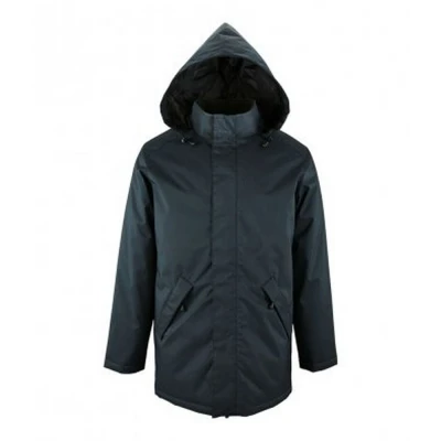Polyester padding and lining. Showerproof and windproof. Concealed detachable hood with adjusters. Fleece lined collar. Full length zip with stud and tear release storm flap. Two front pockets. One internal pocket. Tear release adjustable cuffs. Open hem. Access for decoration. Materials: Polyester outer with PVC coating.