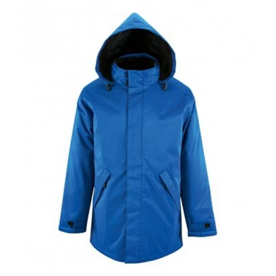 Polyester padding and lining. Showerproof and windproof. Concealed detachable hood with adjusters. Fleece lined collar. Full length zip with stud and tear release storm flap. Two front pockets. One internal pocket. Tear release adjustable cuffs. Open hem. Access for decoration. Materials: Polyester outer with PVC coating.