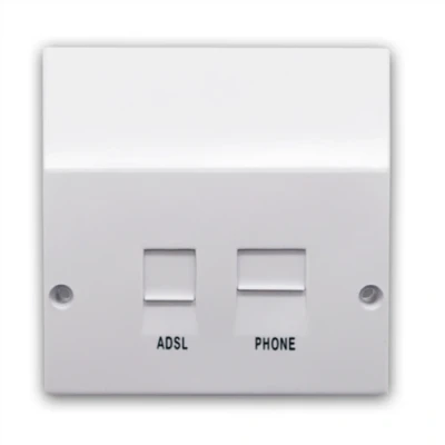 Solwise ADSL Faceplate Splitter - A splitter of the type installed and used by the BT engineer for an installed ADSL service. Replaces the lower half of the BT 'NTE5' master box and provides connections for both telephone and modem at sockets on the front panel. Connections are also provided for both filtered (phone) and un-filtered (modem) extensions hard-wired from the rear.