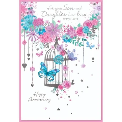 THE PERFECT CARD: This 13 x 19 cm anniversary card features an embossed and glitter detailed design of a bird cage hanging with hearts, butterflies and flowers. MEANINGFUL MESSAGE: The inside of the card contains a lovely verse wishing the son and daughter-in-law a happy anniversary and lots of special moments to share as a couple. "With love and wishes for a very happy anniversary." HIGH QUALITY CRAFTSMANSHIP: Simon Elvin cards are known for their excellent construction, using premium cardstock and detailed designs finished with touches of foil and embossing. SENTIMENT SUITED FOR THE OCCASION: With the message focused on celebrating their anniversary, this card is ideal to send to honor your son and daughter-in-law on their special day. LASTING EXPRESSION OF THOUGHTFULNESS: A greeting card is a small but meaningful way to show you care on their anniversary and wish them many more happy years together as a family.
