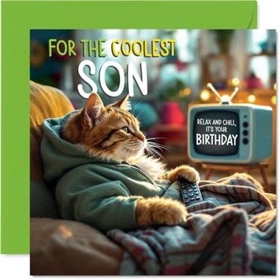 Son Birthday Card TV Cat Happy for from Dad Mum, 145mm Celebration Bday Greeting Cards