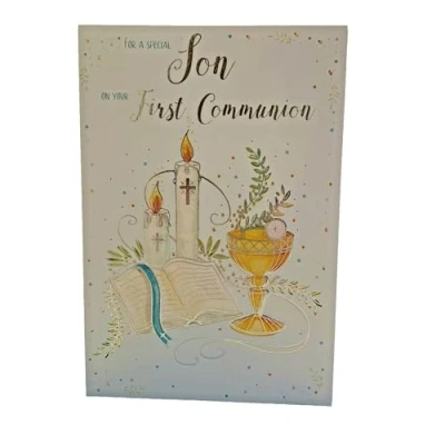 For a special Son on your first communion card with candles, book and goblet design Embossed silver foil finish Colour design insert leaf inside with message Blue envelope Size: 155 mm x 230 mm