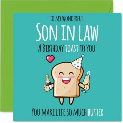 MAKE YOUR SON IN LAW SMILE WITH THIS UNIQUE BIRTHDAY CARD: This exceptional quality Son in Law birthday card shows the design 'To my wonderful Son in Law a birthday toast to you. You make life so much better'. If you are looking for a beautiful birthday card Son in Law, then then this happy birthday Son in Law card is bound to make them smile. Not just a birthday card for Son in Law this could also be a birthday gifts for Son in Law, Step Son or Son in Law. WHAT DO YOU GET: The card is printed on one side and BLANK ON THE INSIDE to allow you to write your very own message. The unique fun design is printed on a specially sourced and environmentally responsible board. At 360 microns thick the natural white one-sided gloss board has a quality look and feel. Supplied with a coloured gummed envelope to complement the design and ready to be sealed and sent in the post. Son in Law Bday cards, Step Son birthday cards, Son in Law birthday card. NO INK SMUDGES: There is nothing worse than writing inside a card to find that the shiny surface makes the ink smudge. This is why we use a high quality one sided coated board. The uncoated side will absorb more of the ink from your pen to make smudging a thing of the past. Son in Law birthday cards, Son in Law birthday cards from Mother Mum. SIZES: Greeting Card = 145mm x 145mm, Envelope = 155mm x 155mm, Card Thickness = 360 micron. Happy birthday Son in Law, Son in Laws birthday card, Son in Law cards birthday, birthday card Son in Law, happy birthday Son in Law card, Son in Law gifts from Mother Mum. MADE AND QUALITY CHECKED IN THE UK: We print and manufacture all our products right here in the UK so you can be sure of a fast turnaround and a product that is expertly made. Using environmentally responsible premium board our card is conscious of the responsible management of the world's forests - happy birthday card Son in Law, Son in Law birthday cards.
