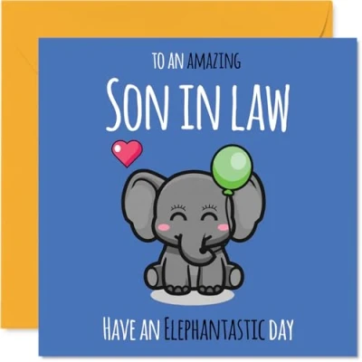 MAKE YOUR SON IN LAW SMILE WITH THIS UNIQUE BIRTHDAY CARD: This exceptional quality Son in Law birthday card shows the design 'To An Amazing Son in Law Have An Elephantastic Day'. If you are looking for an awesome birthday card for Son in Law, then then this happy birthday Son in Law card is bound to make them smile. Not just a birthday card for Son in Law this could also be a birthday gifts for Son in Law, Step Son or Son in Law. WHAT DO YOU GET: The card is printed on one side and BLANK ON THE INSIDE to allow you to write your very own message. The unique fun design is printed on a specially sourced and environmentally responsible board. At 360 microns thick the natural white one-sided gloss board has a quality look and feel. Supplied with a coloured gummed envelope to complement the design and ready to be sealed and sent in the post. Great Son in Law birthday cards, Step Son birthday card. NO INK SMUDGES: There is nothing worse than writing inside a card to find that the shiny surface makes the ink smudge. This is why we use a high quality one sided coated board. The uncoated side will absorb more of the ink from your pen to make smudging a thing of the past. Son in Law birthday cards, Son in Law birthday cards from Mother Mum. SIZES: Greeting Card = 145mm x 145mm, Envelope = 155mm x 155mm, Card Thickness = 360 micron. Happy birthday Son in Law, Son in Laws birthday card, Son in Law cards birthday, birthday card Son in Law, happy birthday Son in Law card, Son in Law gifts from Mother Mum. MADE AND QUALITY CHECKED IN THE UK: We print and manufacture all our products right here in the UK so you can be sure of a fast turnaround and a product that is expertly made. Using environmentally responsible premium board our card is conscious of the responsible management of the world's forests - happy birthday card Son in Law, Son in Law birthday cards.