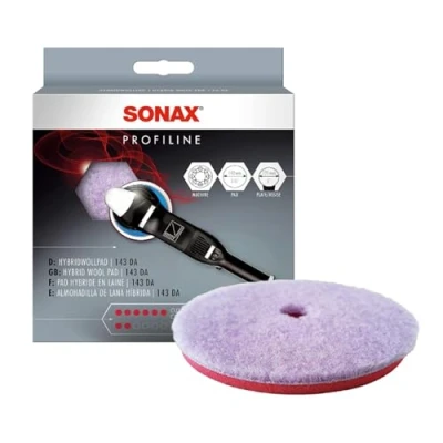 Effective polishing wheel for eccentric polishing machines to remove deep scratches and matting. Shortens polishing time and keeps polishing temperatures low. Long service life. Innovative blend of natural lambswool and polyester. High removal rate without overheating or splashing. Diameter: 143 mm. Only for eccentric polishing machines with 125 mm backing plate. Ideal for the application of SONAX Profiline EXCut in the first polishing stage of a two-stage eccentric process or as a single-stage system with SONAX Profiline Cut & Finish. Box contents: 1x SONAX 04938000 hybrid wool pad 143 DA (1 piece) SONAX Car care products - Made in Germany - so that what moves us shines.