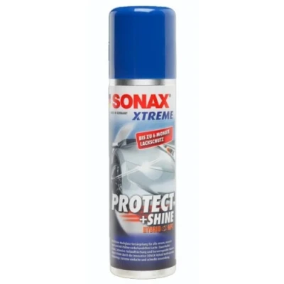 SONAX Xtreme Protect & Shine Hybrid NPT - 210ml. Does not come with Cloth or Applicator Surface protection using Hybrid Polymer Technology for all paintwork surfaces. Sonax Protect + Shine protects the paintwork by means of a resistant network of organic and inorganic components. This new generation of polymers produces crisp, clear reflections while protecting paintwork from UV rays, acid rain, bird droppings, airborne contaminants and even road salt. Quick and easy to apply, it intensively freshens up the colours and produces a silky soft surface with an outstanding lotus effect. The perfect complement to paintwork sealing with SONAX ProfiLine Nano paint protect. 210 ml Aerosol