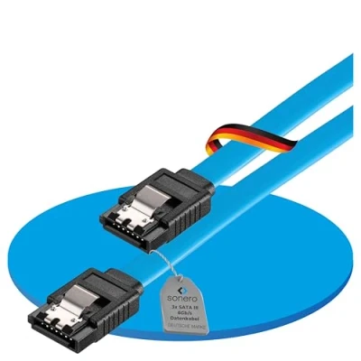 The cable set from Sonero consists of 3 x 0.50 m SATA data cables has been specially developed for connection to hard drives and DVD drives, making the cable ideal for transferring data at 6GB/s. The built-in locking at the end of the data cable ensures that a secure and stable connection between the data cable and a hard drive, thanks to this stable hold, a fast and reliable data transfer is possible. With the Sonero data cable you can transfer data at up to 6Gb/s, this is twice as fast as SATA II, in addition to data transmission, the cable is backwards compatible with SATA I and SATA II. It is also possible to use older models and the cable is much more flexible in the various areas of application. With the flat and high-quality built SATA connector, the PC power connectors can be easily and easily used for graphics cards, hard drives or, for example, HDD, SSD or DVD drives. Included are 3 high-quality SATA III data cables with up to 6 GB/s, in a length of 0.50 m in blue.