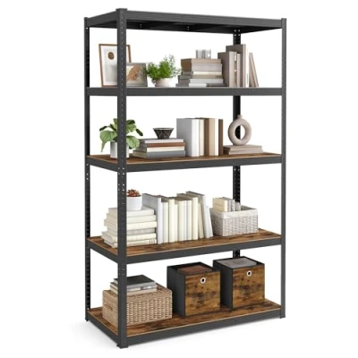 [Sturdy Structure] Sturdy particleboard shelves are supported by the steel frame with additional reinforcement bars, each shelf can hold up to 150 kg, and safely support paints, tools, and fitness equipment [Rustic Look] The shelves of the shelving unit are finished with rustic brown wood grain, adding a stylish effect to any space so you can say goodbye to the boring look [Divided into 2 Units] The shelving unit can be divided into two separate low shelves, one placed in the kitchen as a stand for the oven and microwave, the other in the study for holding books, plants, printer, and more [Adjustable Shelves] The assembly of the storage shelf is effortless, as parts can be connected together with slot-in joints, and the height between shelves can be adjusted for flexible storage [Anti-Tip Kit] The included anti-tip kit helps you fix the shelf to the wall so that the shelving is more stable for safe use