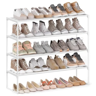 SONGMICS 4 Tier Shoe Rack, Storage Organiser, Metal Upright or Upside Down, Fits 16 to 20 Pairs, Stackable, for Hallway, 30 x 92 74 cm, Pearl White LSA014WK01
