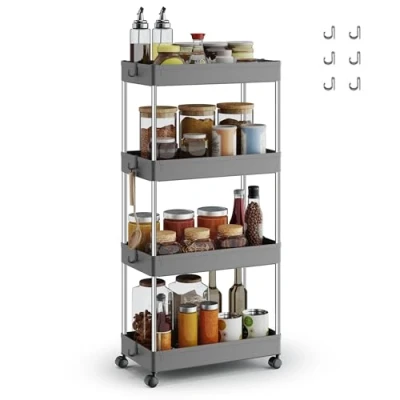 Optimize Small Spaces: Designed to utilize every inch, this 23.6 x 42 x 86 cm slim storage trolley fits perfectly in narrow spaces in kitchens, laundry rooms, or bathrooms, enhancing organization without sacrificing valuable space Convenient Removable Hooks: Equipped with 6 adjustable hooks that can be set on the side or front, this versatile utility cart keeps kitchen towels, brushes, or potholders within easy reach Robust and Durable: This kitchen trolley, reinforced by a sturdy stainless steel frame, can hold a load of up to 20 kg, offering a stable and enduring storage solution for long-term use Easy to Move: With 360° casters, this storage trolley smoothly slides into or out of narrow spaces, making cleaning a breeze Spacious and Versatile Baskets: The 4 baskets offer ample storage for kitchen or bathroom essentials. They can also be used separately on countertops or in cabinets