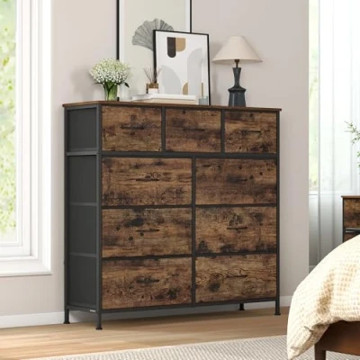 SONGMICS Chest of Drawers, 9 Storage Drawers Bedroom, Unit, Steel, MDF, Non Woven Fabric, for Closet, Hallway, Living Room, Rustic Brown and Ink Black LGS324BH04