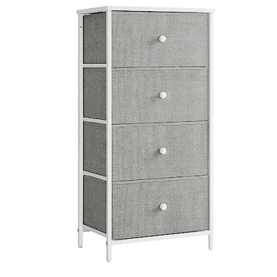 [How to Style Your Storage] Video games and various cables well organised in this 4-drawer dresser near your TV, and a potted plant and photo frame displayed on the chic top—your living room can be tidy in style [Pleasing to the Eye] The mix of dove grey and cream white, along with smooth solid wood knobs—all these details merge together on this chest of drawers to give your home a charming look [Sturdy-yet-Lightweight] With a metal frame, particleboard top, fabric drawer front, and crossbars on the back, you get a stable and durable yet lightweight storage unit for years to come [Versatile] Bedroom or living room? Put it anywhere you like. Whether you need a chest of drawers for tiny clothes in the nursery, a sundries organiser in the entryway, or extra storage for clothing, these storage drawers are the ticket [What You Get] A space-saving storage tower with 4 fabric drawers, a stunning look that will style your living space, lightweight design for easy moving, 4 adjustable feet, easy assembly, and the possibility to restore a tidy home