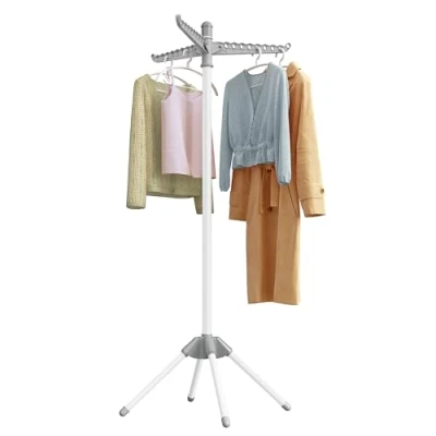 [Foldable & Space-Saving] Standing at 65 x 65 x 150 cm during use, this clothes drying rack takes up little space, perfect for small spaces. Fold the arms and legs into a small size of 5.5 x 5.5 x 182.5 cm, it will stay out of the way after use [Rotate the Arms] The 3 arms let you easily hang up your clothes for air drying. The arms can also rotate 360° so you can easily access the clothes on the other side by simply turning them around [Holds Lots of Clothing] The arms with holes for hangers can hold up to 27 pieces of clothing, with a max. static load capacity of 15 kg. This clothes airer is also perfect for bags or accessories [Easy to Set Up and Carry Around] The rack comes in 7 parts, making it easy to set it up or take it down in a minute, so you can bring it with you for drying clothes when camping [Stable and Solid] The main pole and legs are made of stainless steel for both rust resistance and sturdiness while the 4 legs offer more stability compared with those with 3 legs