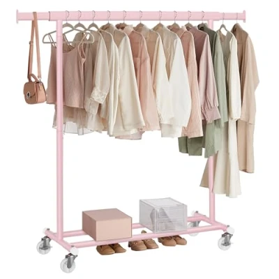 SONGMICS Clothes Rack on Wheels, Heavy Duty Rail, 45 x (92 132) 161.5 cm, with Extendable Hanging 100 kg Load Capacity, Easy Assembly, Portable, Jelly Pink HSR013R01