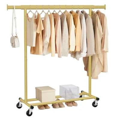 SONGMICS Clothes Rack on Wheels, Heavy Duty Rail, with Extendable Hanging 90 kg Load Capacity, Easy Assembly, Portable, Pale Gold HSR013A01