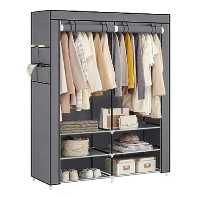 [Robust with High Load Capacity] Made with 16 mm dia. steel tubes and reinforced plastic joints, this clothes rack provides strong support for your clothes (max. static load per rod: 15 kg) and will accompany you through all seasons [Spacious and Versatile] 2 hanging sections with a max. hanging height of 120 cm for fulfilling your daily storage needs for shirts, coats, and skirts; shelves for shoes or bags; this wardrobe keeps your things in perfect order [Includes Side Pockets] Often, the details can make the difference. This fabric wardrobe comes with 4 storage pockets on one side for storing small items such as socks, keys, and gloves. Small design, big difference [Worry-Free Assembly] No need to prepare any assembly tools. All you have to do is to join the metal tubes with plastic connectors and put on the fabric cover—you will be able to assemble this freestanding wardrobe in a short time [What's in the Box] A fabric wardrobe with 2 hanging sections and 4 side pockets, an anti-tip kit, detailed and clear instructions, and a way to keep your room neat and tidy