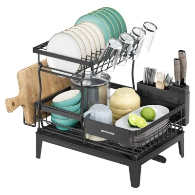 SONGMICS Dish Drying Rack, 2 Tier Drainer for Kitchen Counter, 360 Rotatable and Extendable Spout, Drainboard, with Cutlery Holder, 31 x 42 36.5 cm, Ink Black KCS551BH01