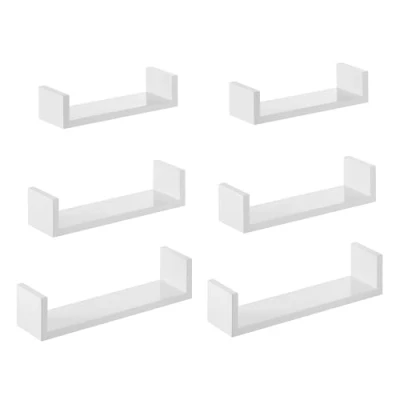 Display in Style: With white surfaces, these 6 stunning wall shelves can be combined in various ways to add character to blank walls while offering space to display decorations or photos Sturdy and Durable: The floating shelves made of high-quality particleboard are strong and durable. Each wall shelf can support up to 10 kg No Falling Off: The side panels of these shelves protect books, CDs, and DVDs from falling, providing a safer perch Easy Installation: Simply drill holes in the wall, install the shelves with the provided screws, and it’s done. Also, clear instructions are included to help you What You Get: A set of 6 wall shelves with a unique U-shape that does not take up floor space; instead, they create extra space in your living room, office, bathroom, or kitchen