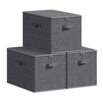 Spacious Storage: Each 50 x 30 x 30 cm storage box has a 45 L capacity, making it easy to neatly sort your clothes, Christmas ornaments, books, and other everyday items Cover on Top: Need to pack the summer clothes away until next year? The lids on these boxes that zip open on three sides will keep them dust-free until you grab them from the bookshelves, above the wardrobe, or under the bed The Right Hue: They are not just containers to throw things into; the linen patterned non-woven fabric with a slate grey hue lends a fitting and breezy feel to compliment your home Options Are Yours: Pull the bin off the shelves with the front handle, or carry it from the living room to the playroom with the 2 side handles. Even better? The box folds flat in a minute until the next time you need it What You Get: A set of 3 storage boxes with zipped lids, 3 handles each to pull it out or lift it up, and a foldable design to save space